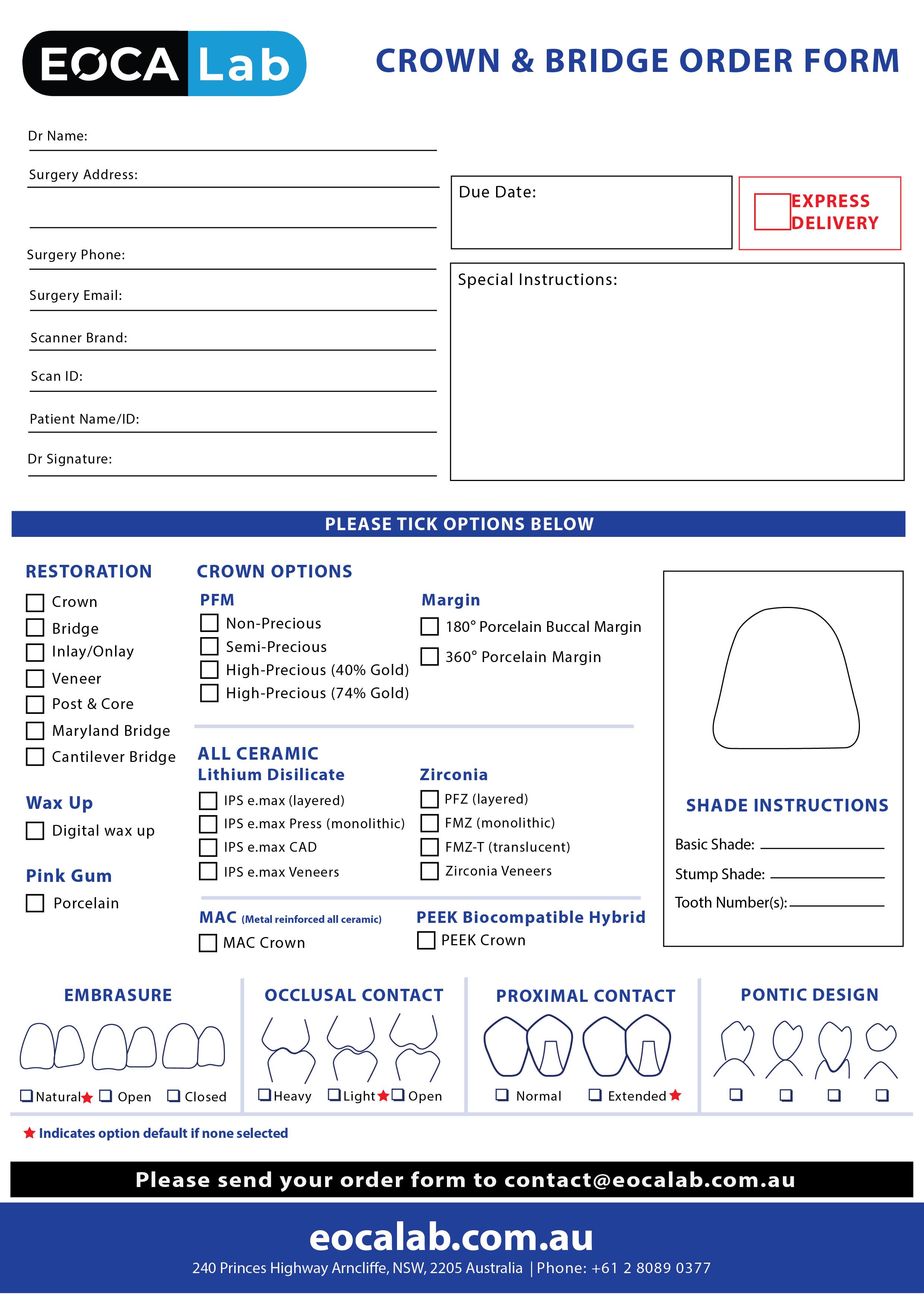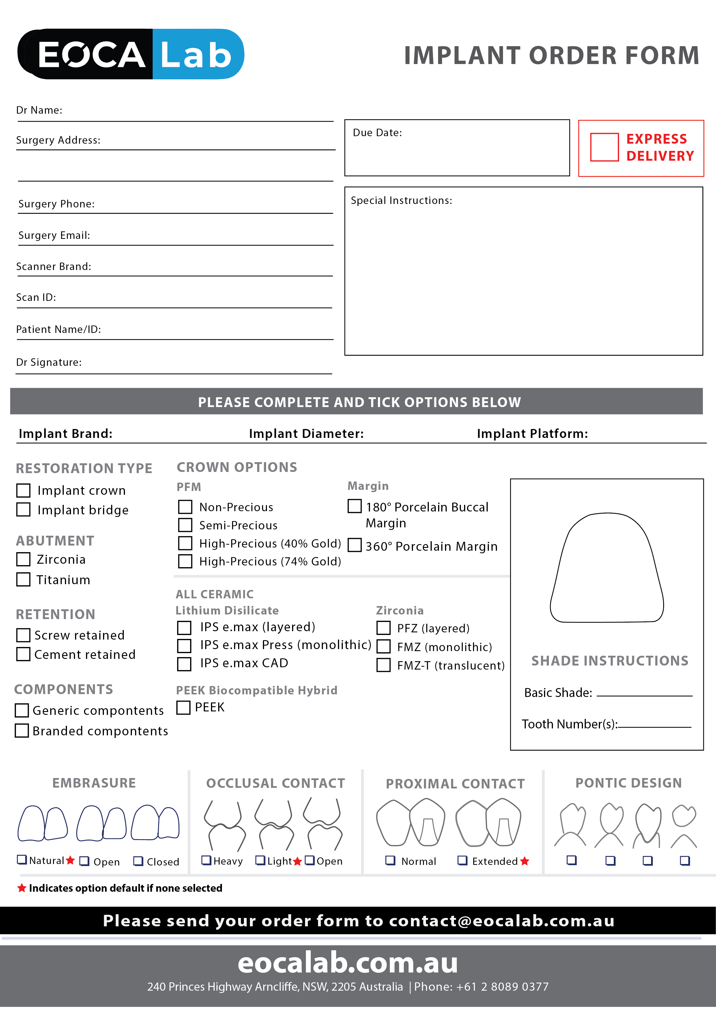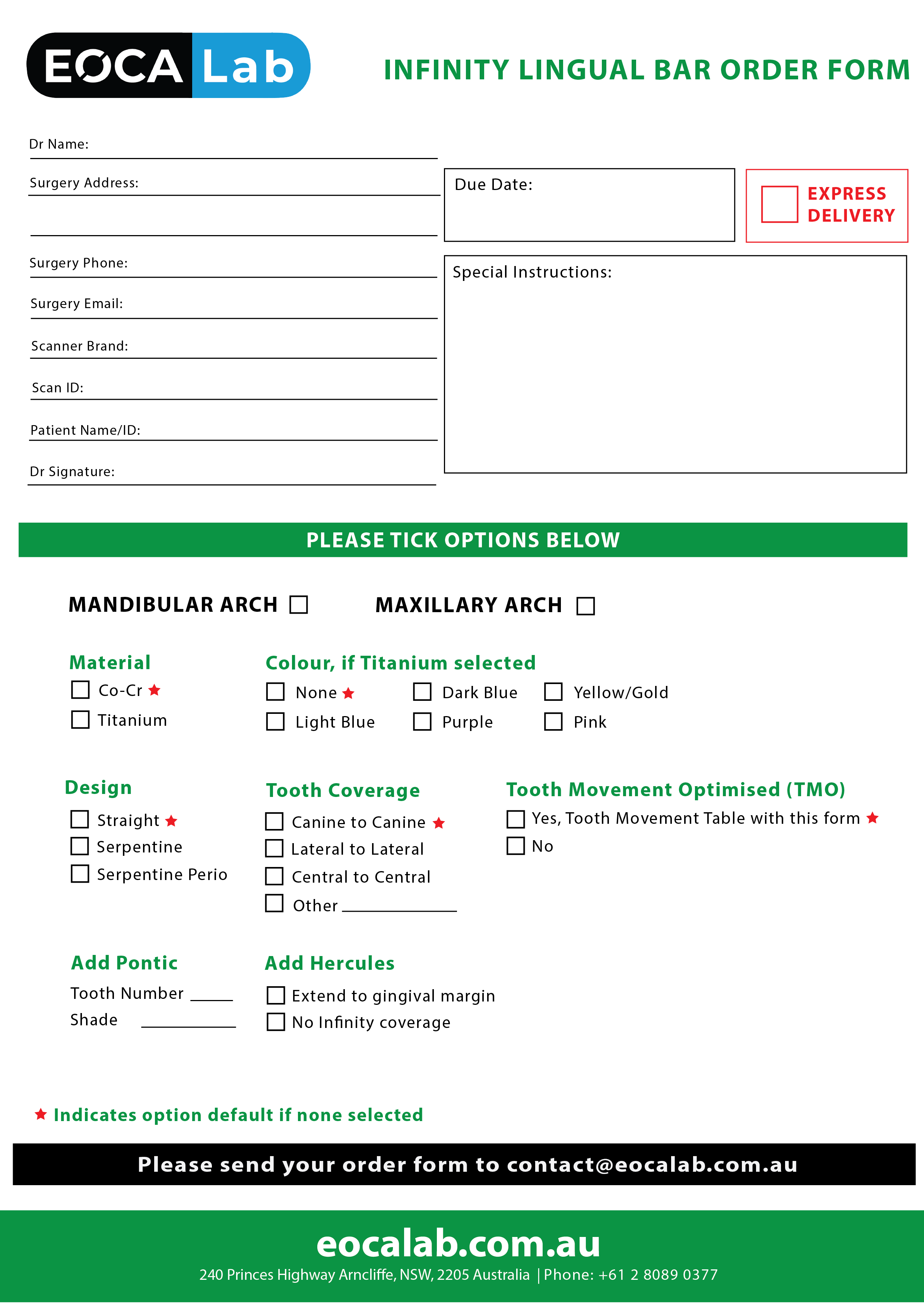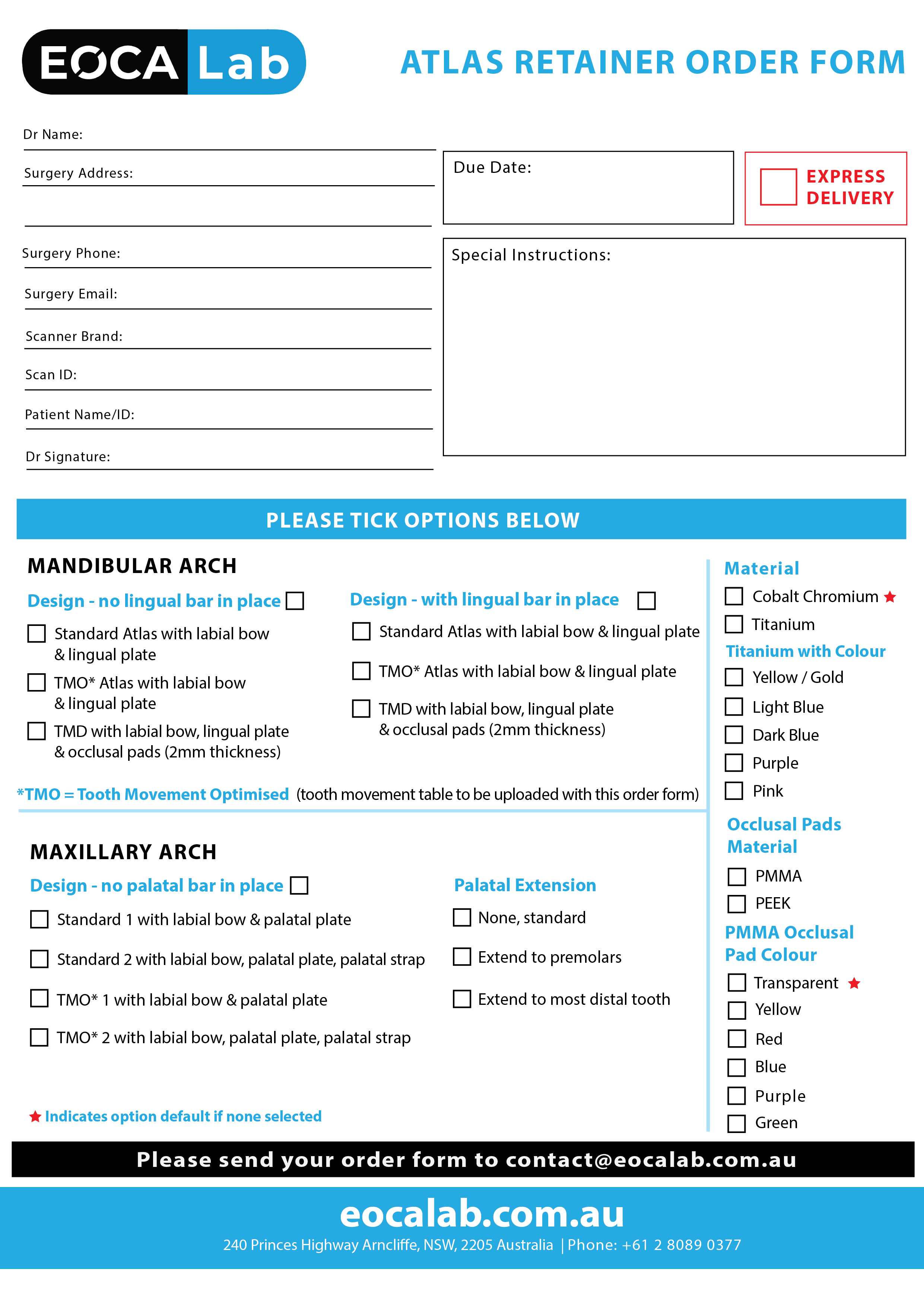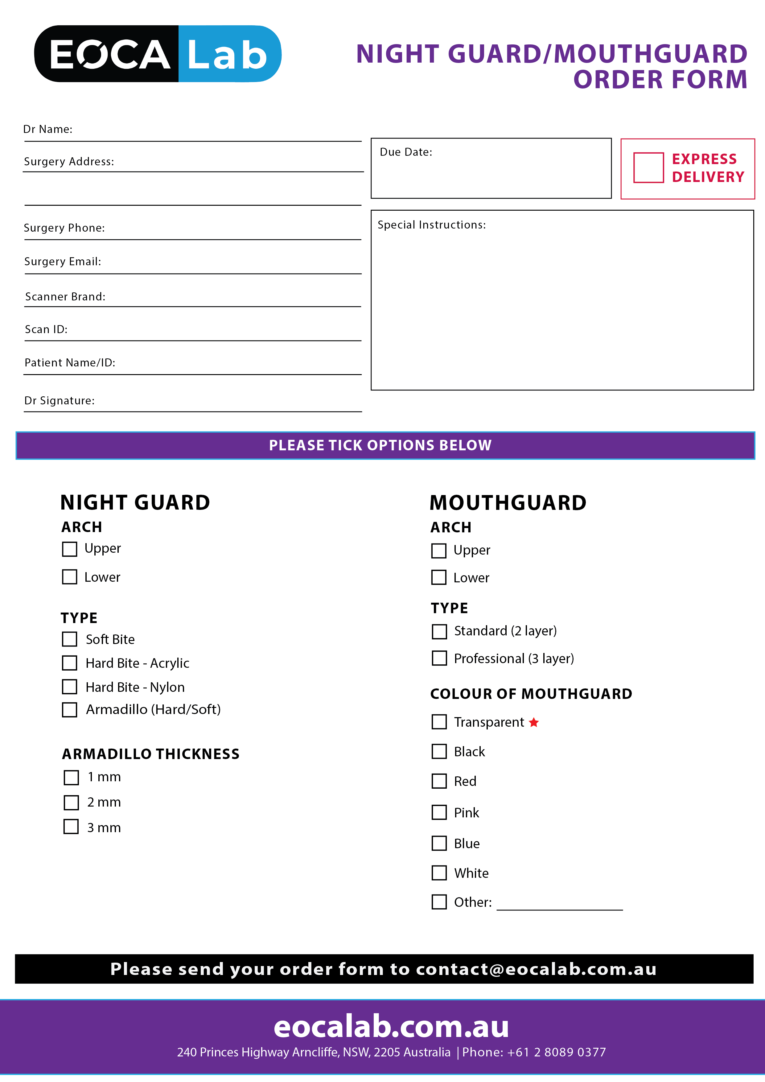 If you choose to use the paper forms, we will create an EOCA Lab account for you and convert this order form to be fully trackable from order submission to fulfilment to shipping to you.